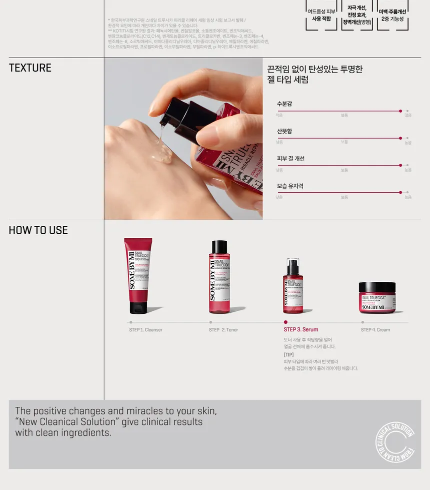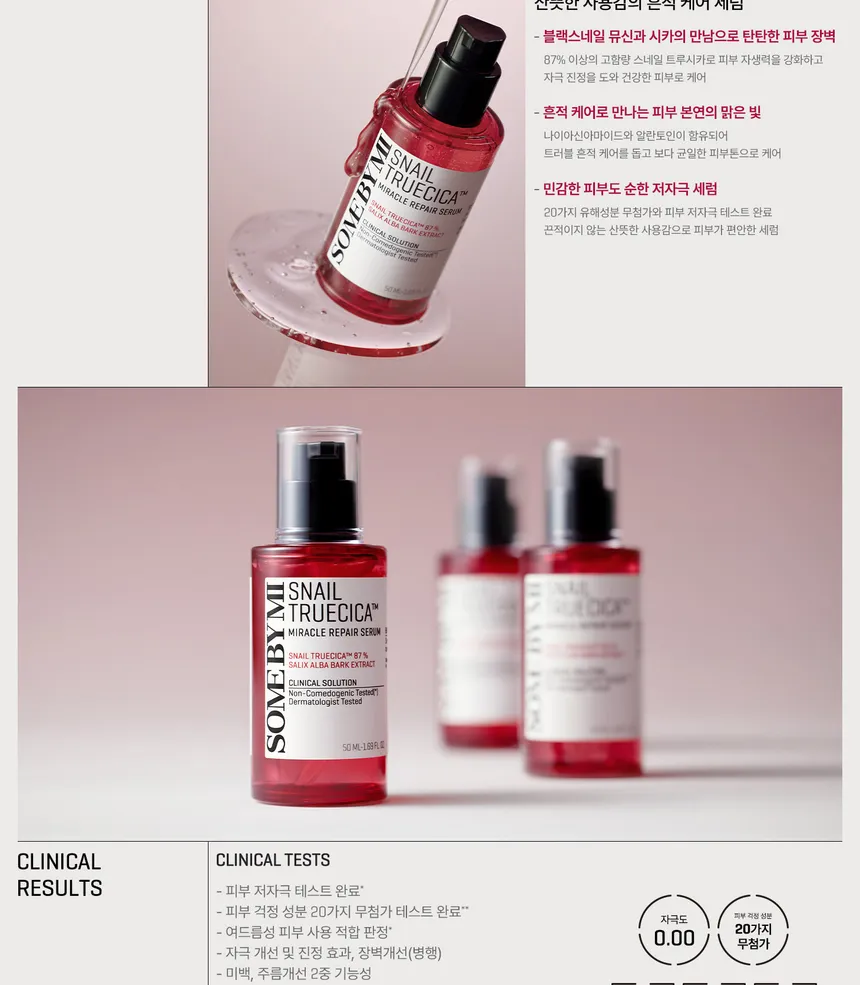 SOME BY MI Snail Truecica Miracle Repair Serum combines the nourishing benefits of snail mucin with the calming and strengthening properties of Truecica. This lightweight serum absorbs quickly to deliver hydration deep into the skin while helping reduce redness and irritation. Snail mucin helps support skin repair and elasticity, while Truecica works to fortify the moisture barrier and promote a smoother, more resilient look. With regular use, it helps improve texture, enhance overall comfort, and leave skin feeling soft, calm, and balanced.
